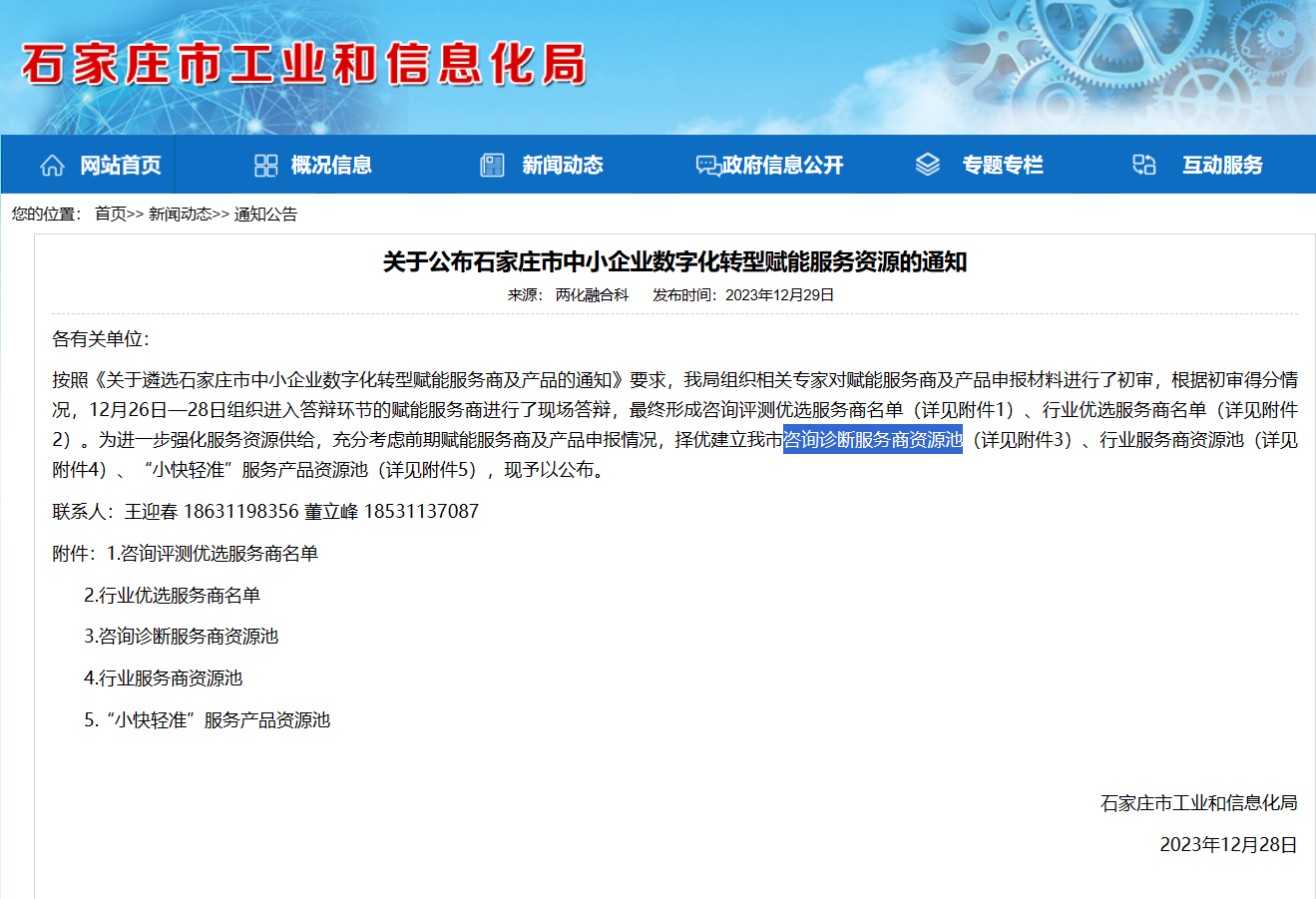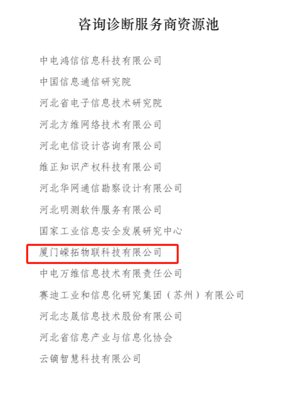 2023年12月29日,石家莊市工業(yè)和信息化局公示石家莊市中小企業(yè)數(shù)字化轉(zhuǎn)型賦能服務(wù)資源名單。廈門嶸拓物聯(lián)科技有限公司入選石家莊市咨詢診斷服務(wù)商資源池。嶸拓物聯(lián)后續(xù)將通過診斷咨詢服務(wù),為石家莊市制造業(yè)中小企業(yè)提供高質(zhì)量的數(shù)字化轉(zhuǎn)型服務(wù)。