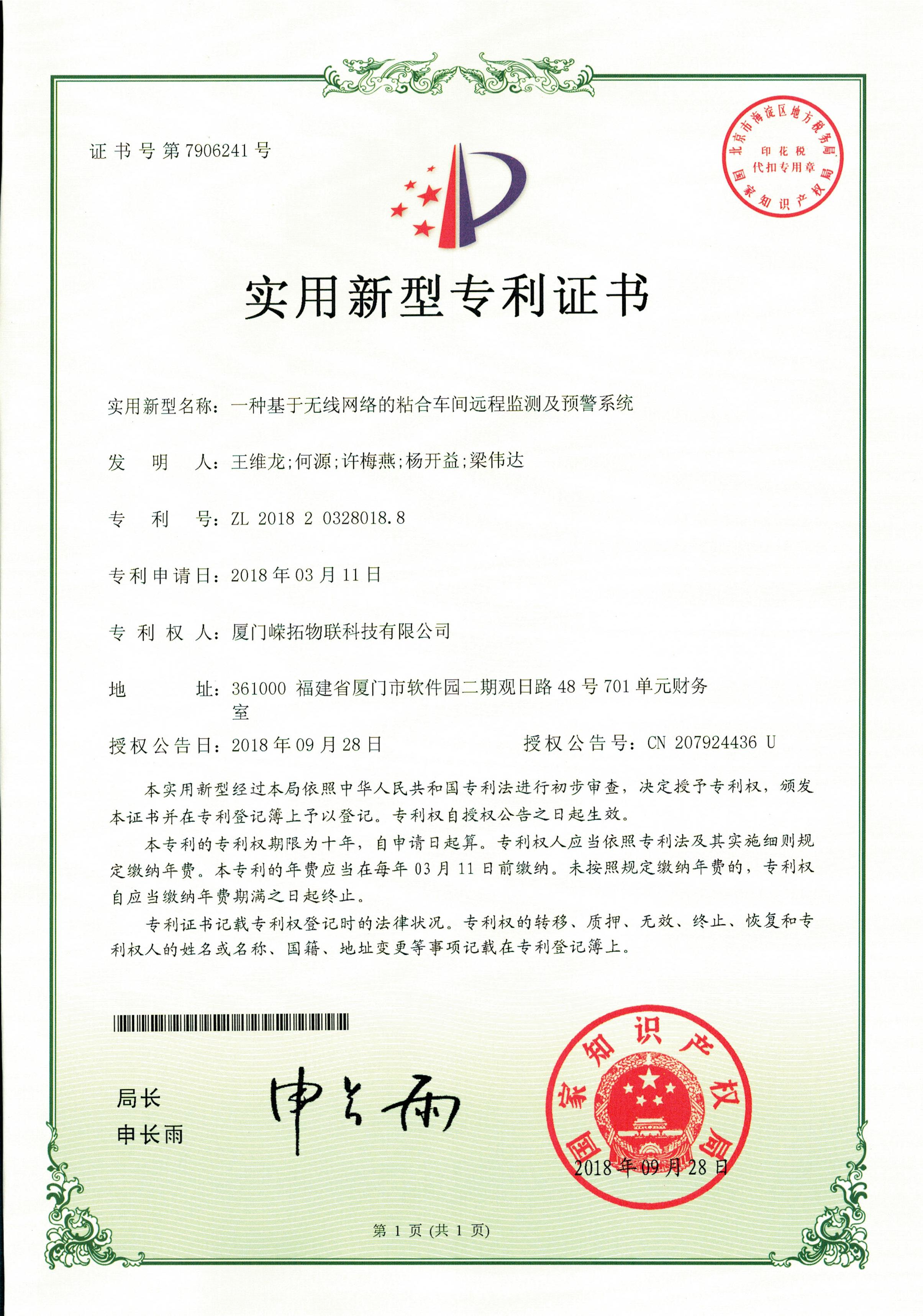 本實用新型通過數據采集模塊來監(jiān)測粘合車間中揮發(fā)性有毒氣體濃度信號的變化,獲取相關模擬信號,進行分析、處理后,將相關數據信息通過無線網絡的方法上傳至服務器,再由服務器進行進一步分析、處理后同樣通過無線網絡傳輸至顯示屏顯示,如果揮發(fā)性有毒氣體濃度高于國標上限,則通過預警裝置發(fā)出預警,實現粘合車間揮發(fā)性有毒氣體的遠程智能化監(jiān)測及預警。