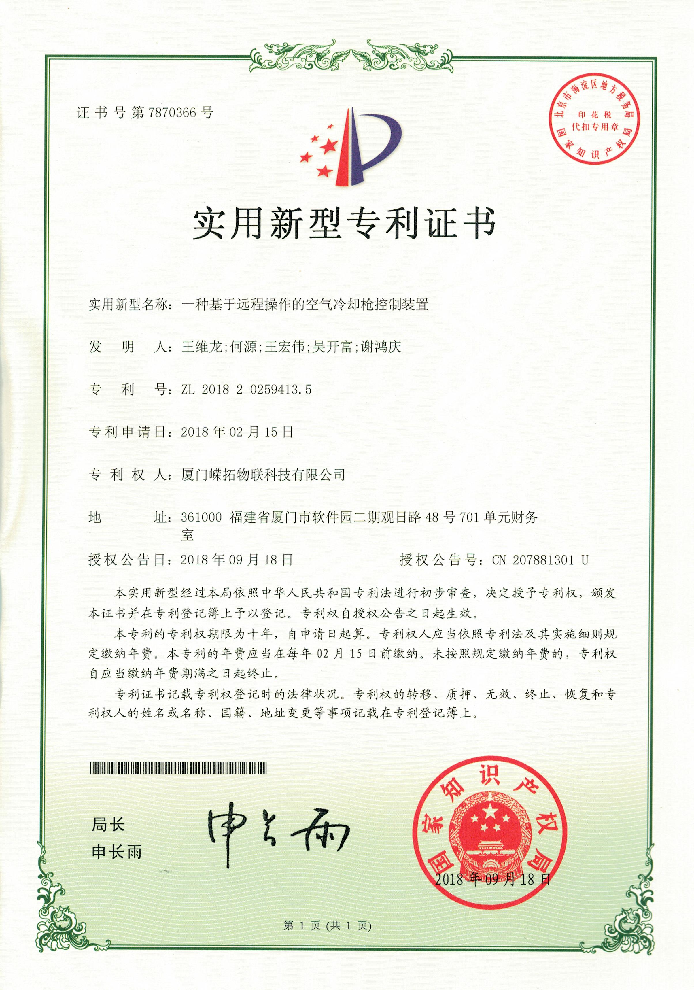 本實(shí)用新型通過無線傳輸模塊接收數(shù)據(jù),結(jié)合溫度傳感器采集的溫度信號經(jīng)過處理分析,對閥門下達(dá)開、關(guān)等命令,達(dá)到控制空氣冷卻槍的輸出溫度,解決了手動(dòng)調(diào)節(jié)溫度的不靈活、不方便、不準(zhǔn)確等缺點(diǎn),實(shí)現(xiàn)對空氣冷卻槍的遠(yuǎn)程操作。